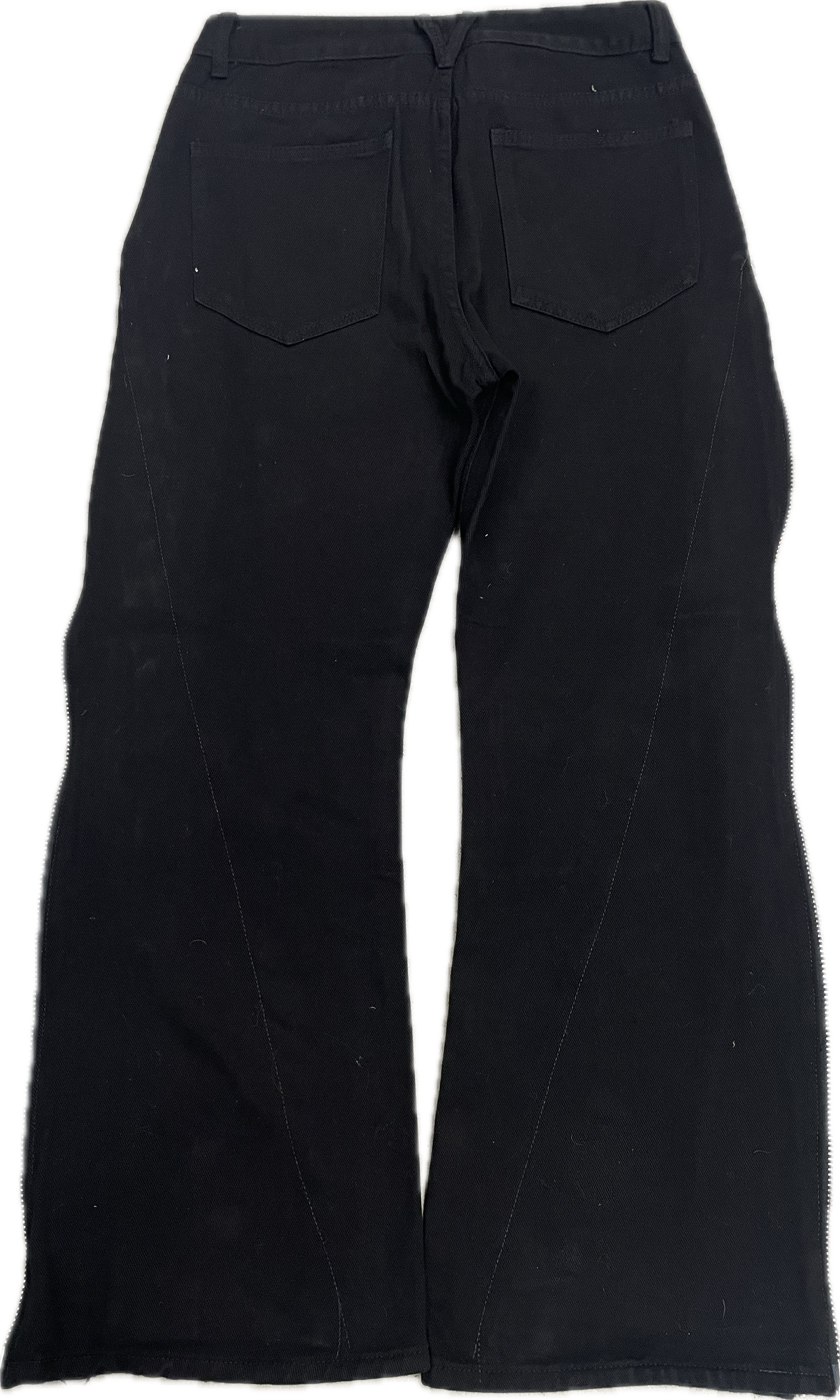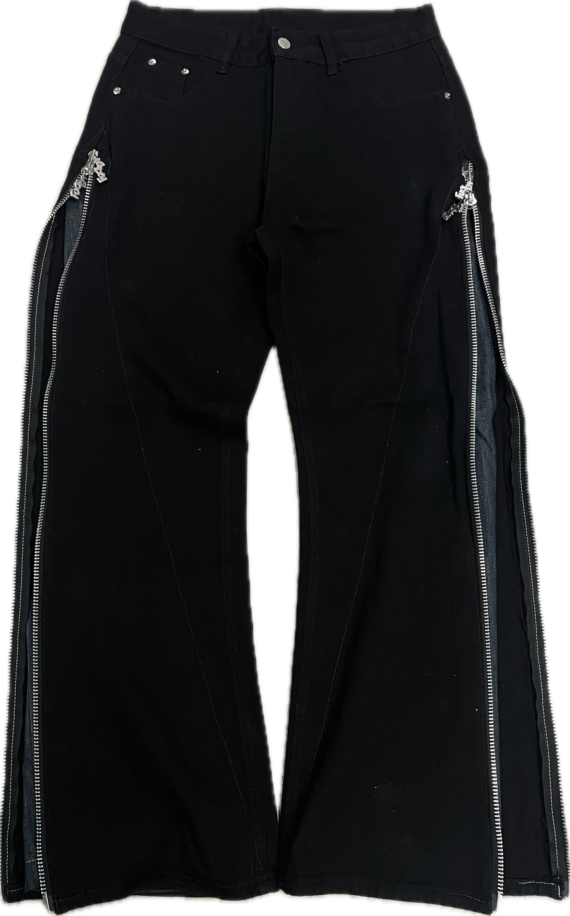 This pair of black jeans featuring a dark blue selvedge denim interior, double zipper ykk #10 with custom zipper on either side and a flared fit. This pair is perfect to put a spin on an all black outfit.