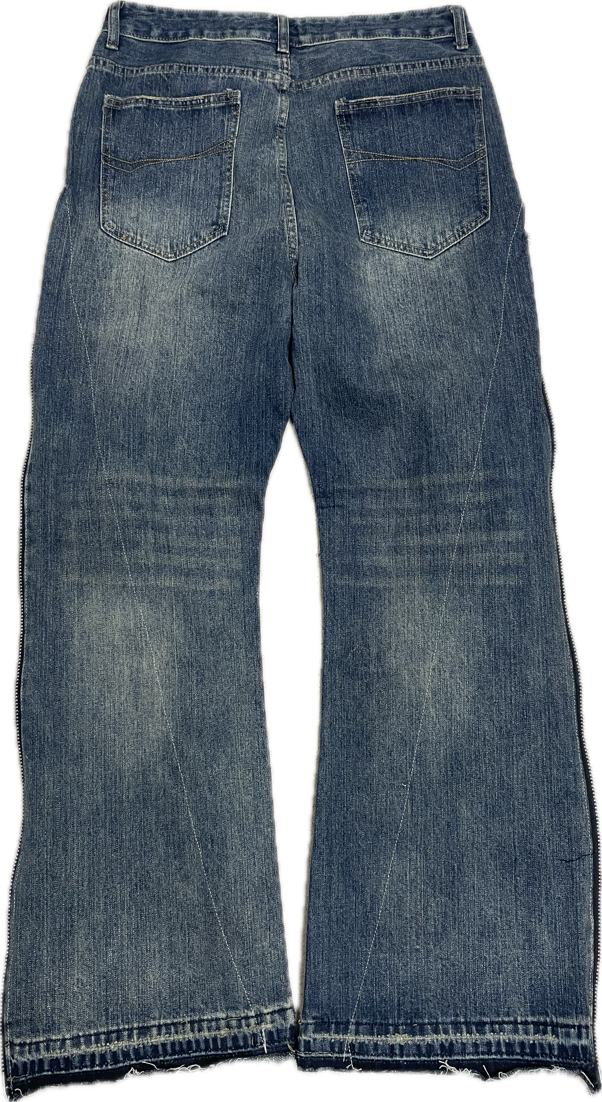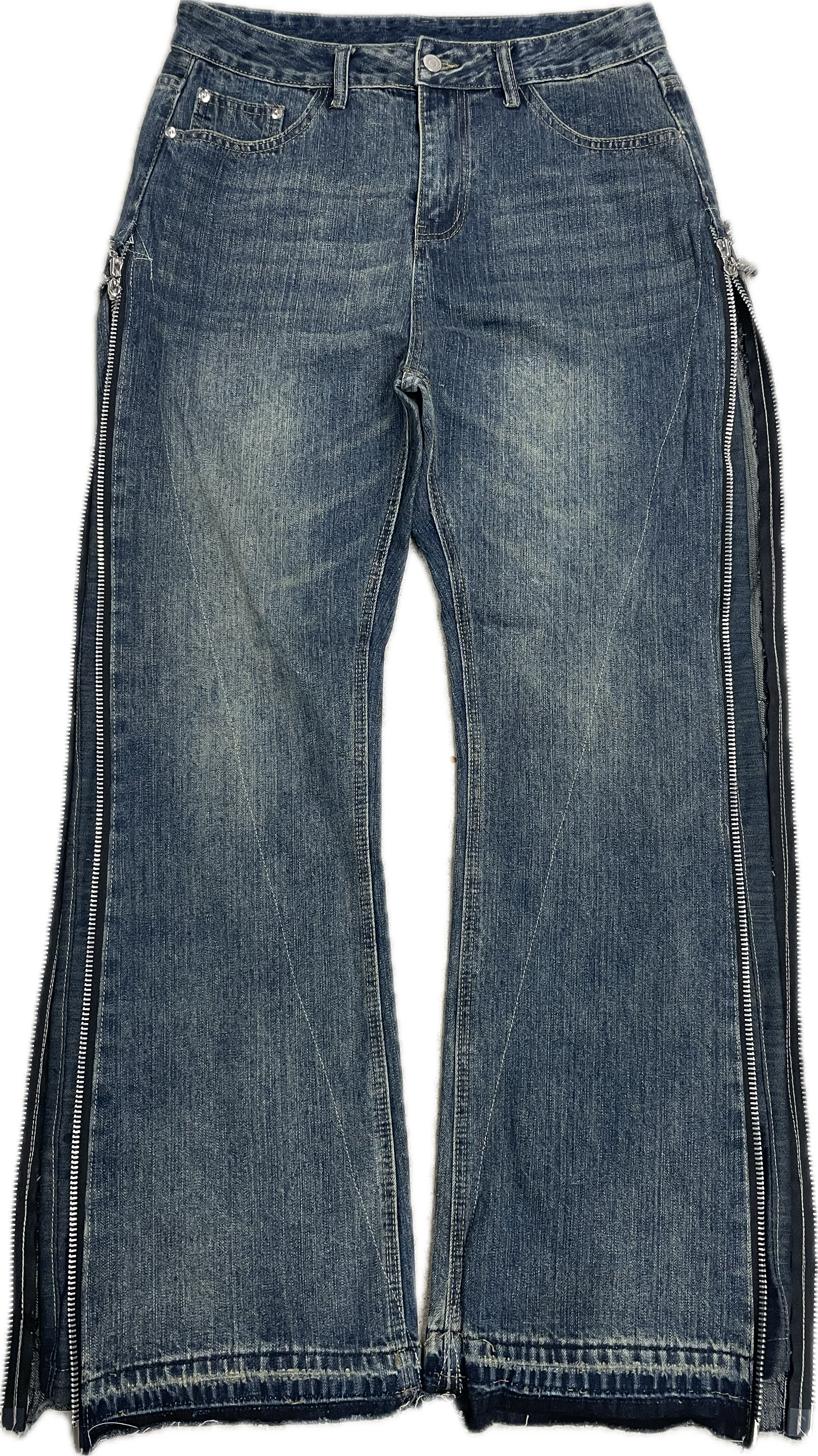 This pair of pants features a YKK #10 2 way zipper, custom zipper pull, selvedge denim interior, and a flared look.
