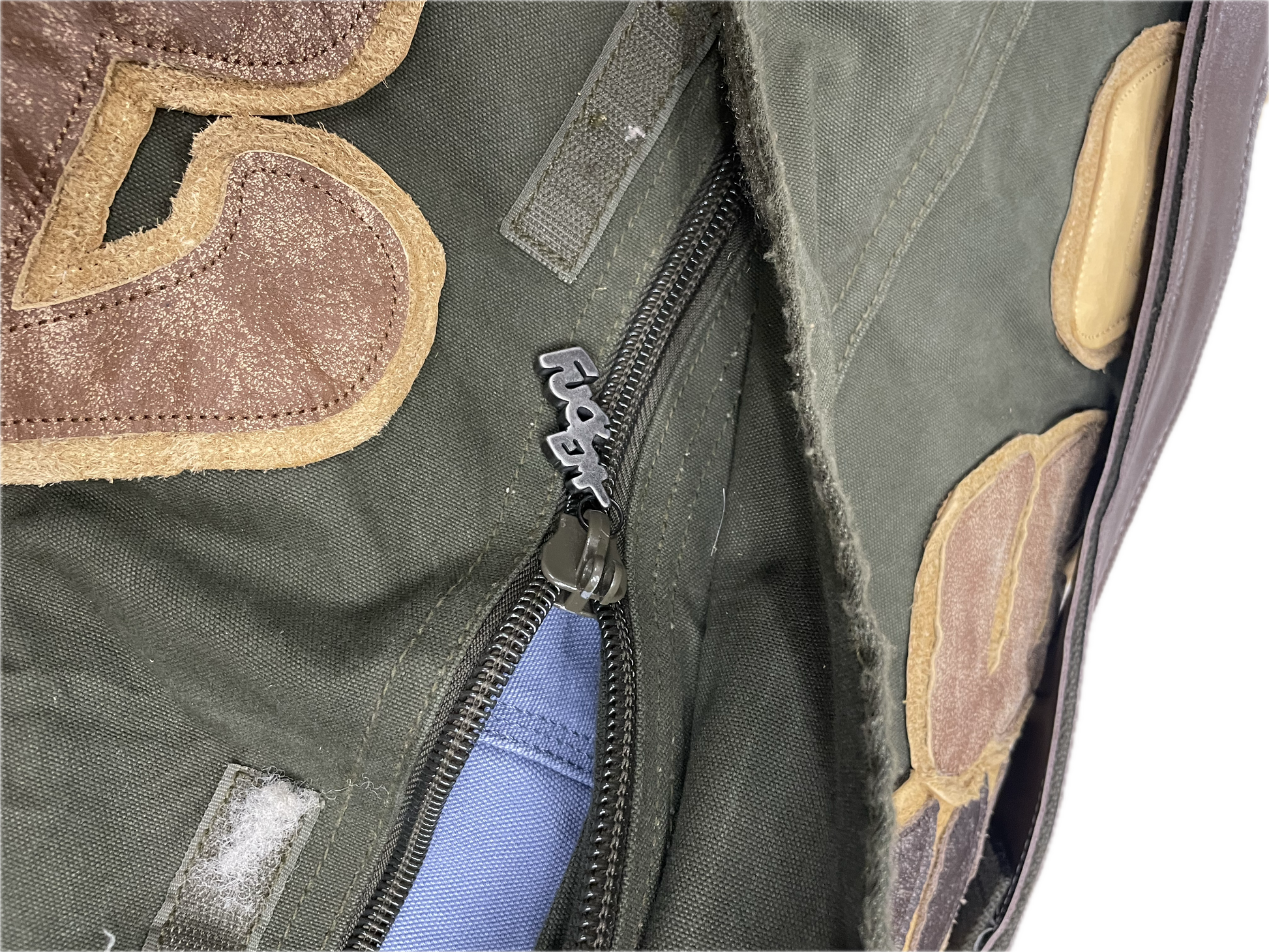 Adding to its unique character, the bag is adorned with nine distinct patches, each showcasing bold, graffiti-style "Fuck ‘Em" graphics in various fonts and colors—black, white, and brown—creating a rebellious, streetwear-inspired vibe. These patches are strategically placed across the bag, giving it a rugged, patchworked look that’s both eye-catching and personal. At one end, a custom zipper patch adds an interactive element, allowing you to access a secure compartment with ease while enhancing the bag’s edgy aesthetic.