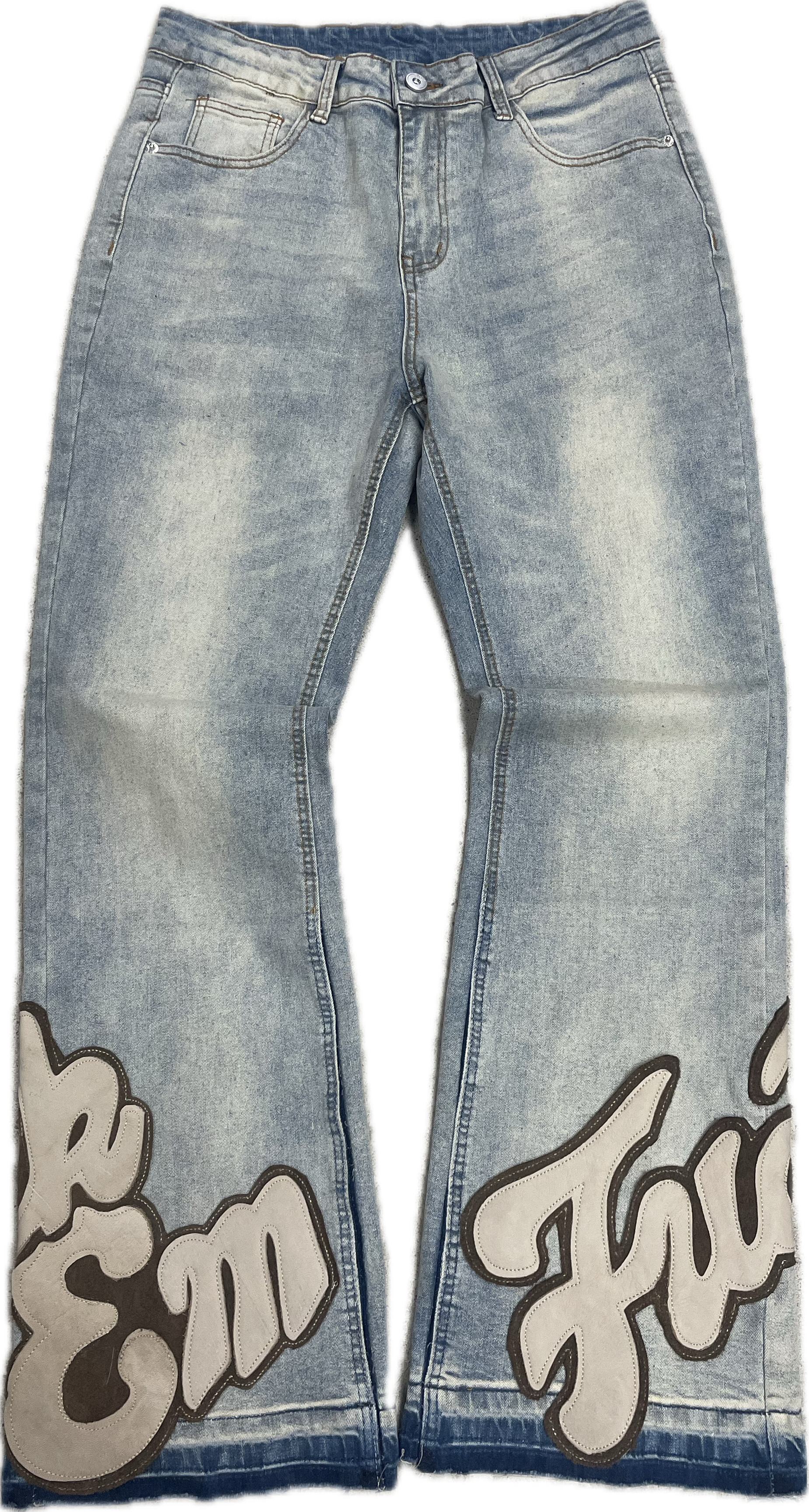 This is a pair of light was pants that have been flared out, extended, and modified with a double layer genuine leather patch on each ankle providing a very subtle way to stand out and let people know you aren’t here to play