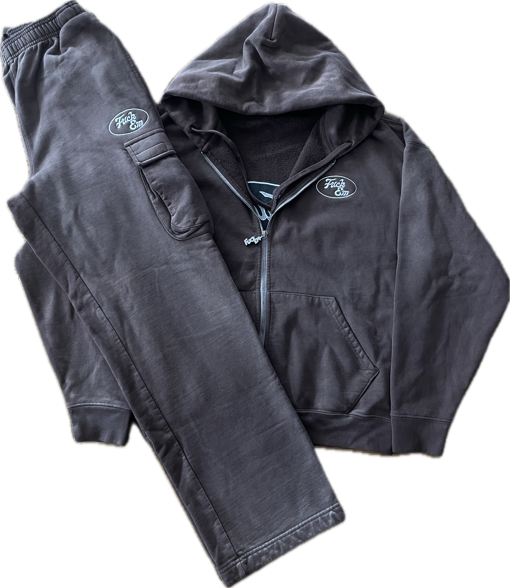 This Sweatsuit features high quality thick material, a custom zipper pull, heavy embroidery, cargo pockets on the pants, and a secret zipper pocket on the inside of the left pocket. Both the pants and hoodie are adjustable closure with inside strings for easy hideaway. Great fit and a comfy wear, built for constant wear.